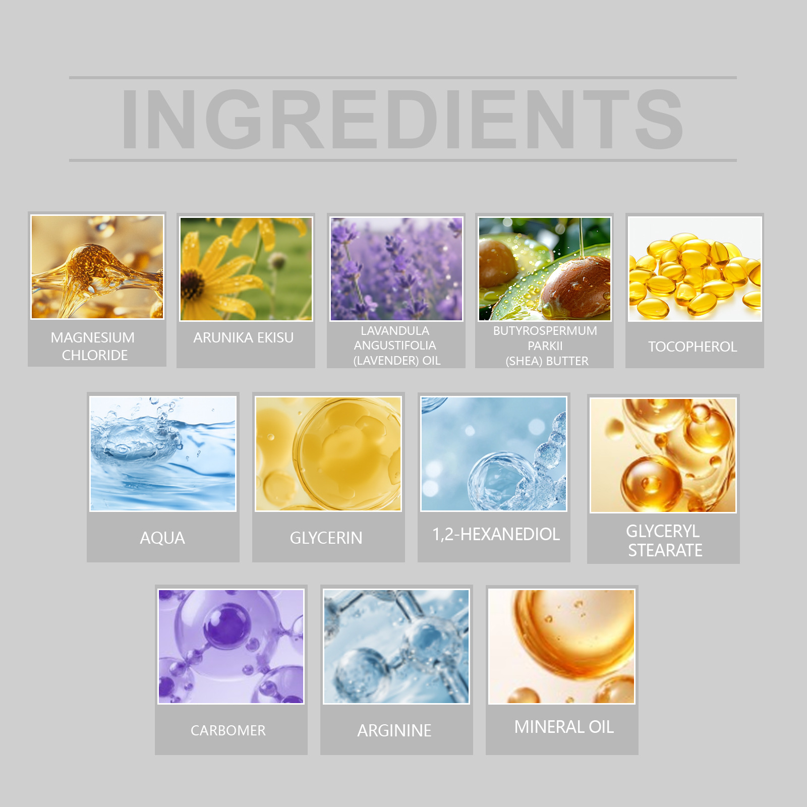 Product Ingredients: Active Ingredients: Tocopherol (Vitamin E), Magnesium Chloride, Arnica Extract, Lavender Oil, Shea Butter; Inactive Ingredients: Water, Mineral Oil, Glycerin, Glyceryl Stearate, 1,2-Hexanediol, Carbomer, Arginine.