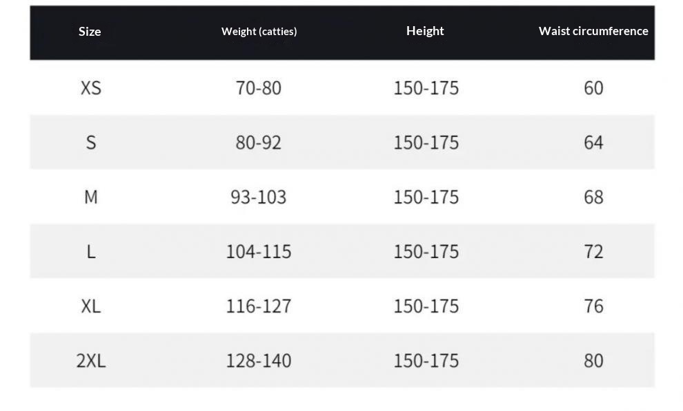 Sizes: XS [recommended for 35–41.5 kg], S [recommended for 40–47.5 kg], M [recommended for 48–54 kg], L [recommended for 54.5–59 kg], XL [recommended for 59.5–64 kg], 2XL [recommended for 64.5–70 kg]