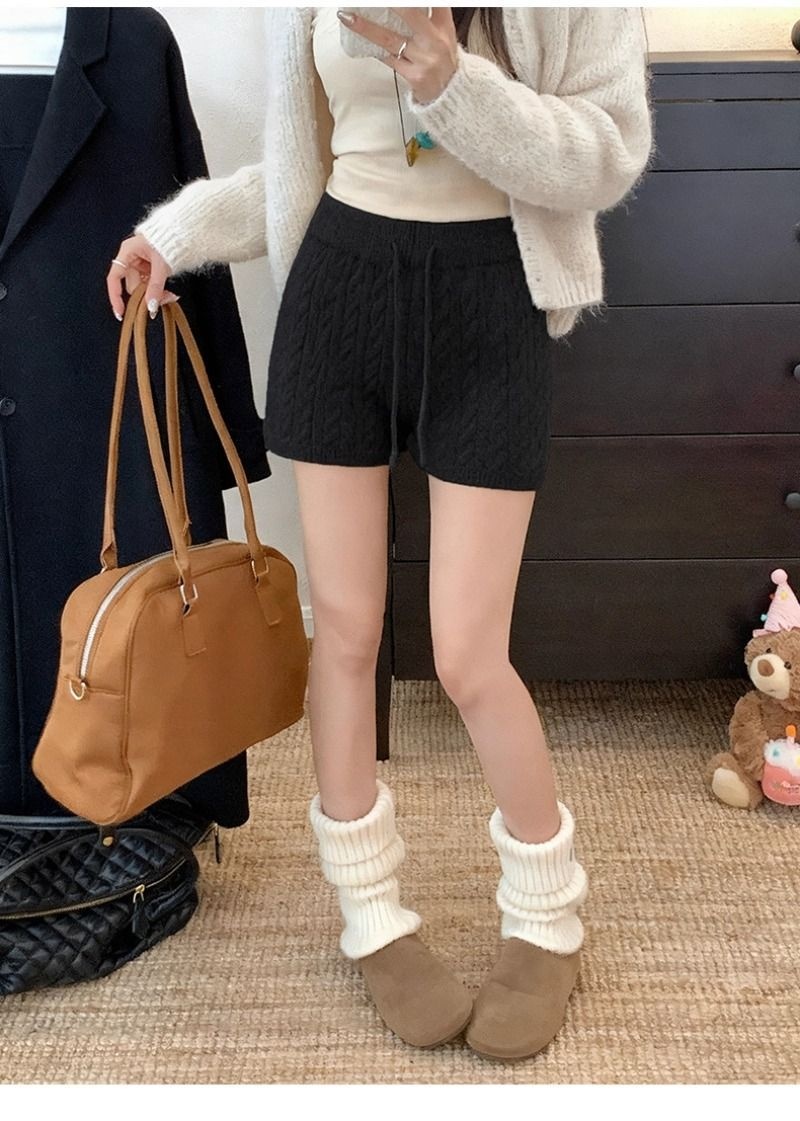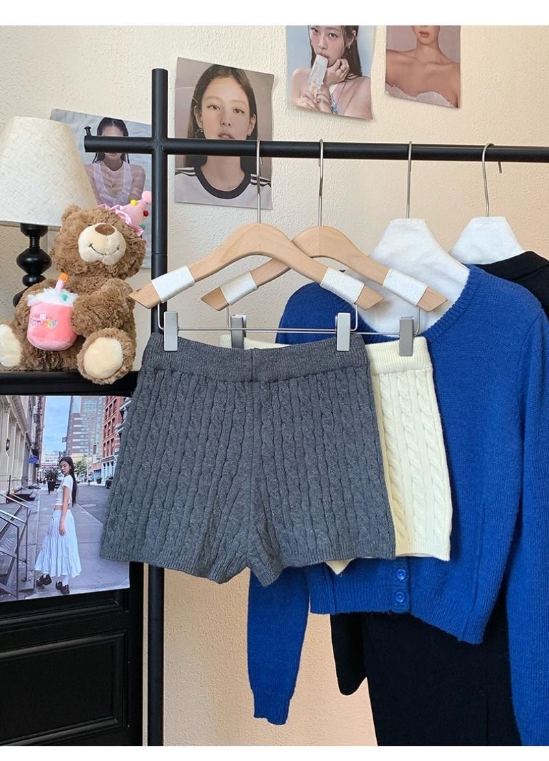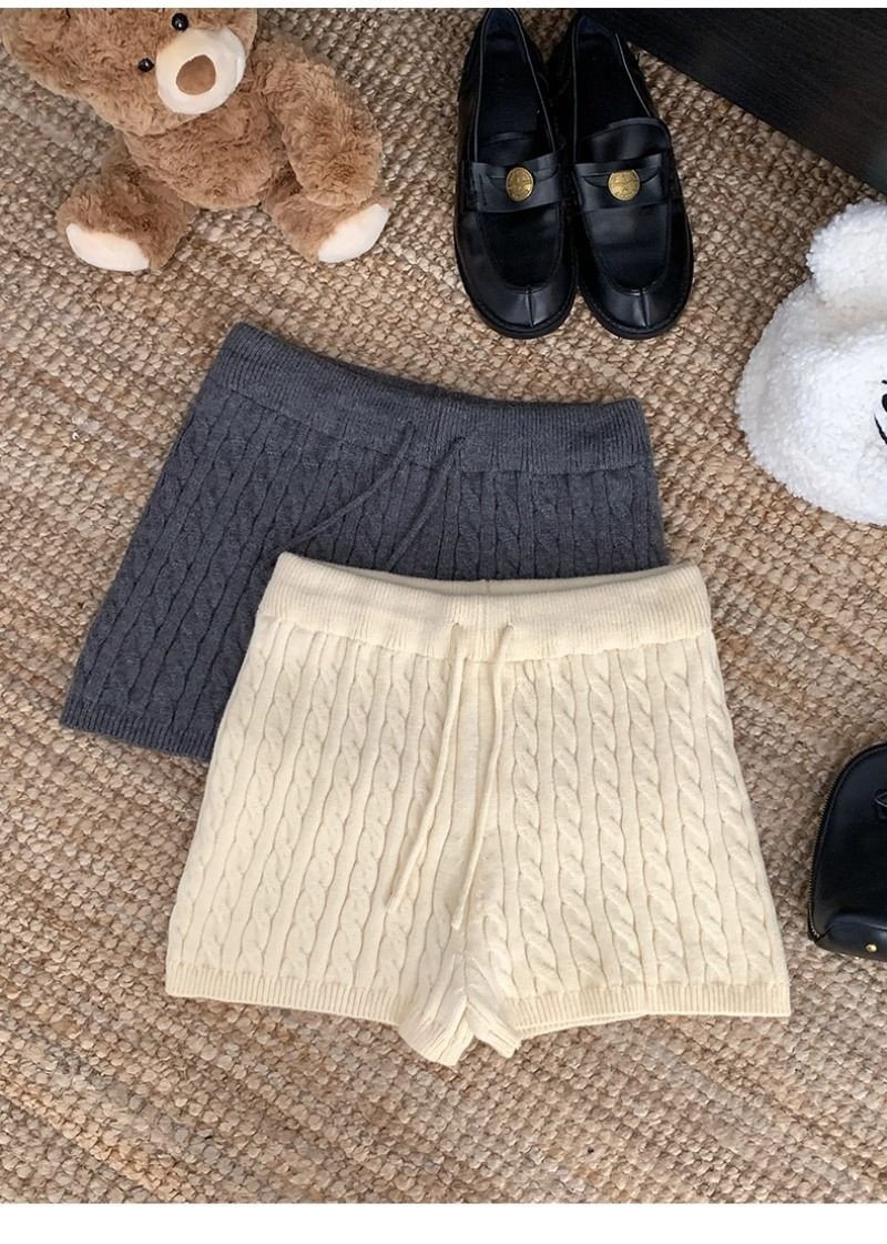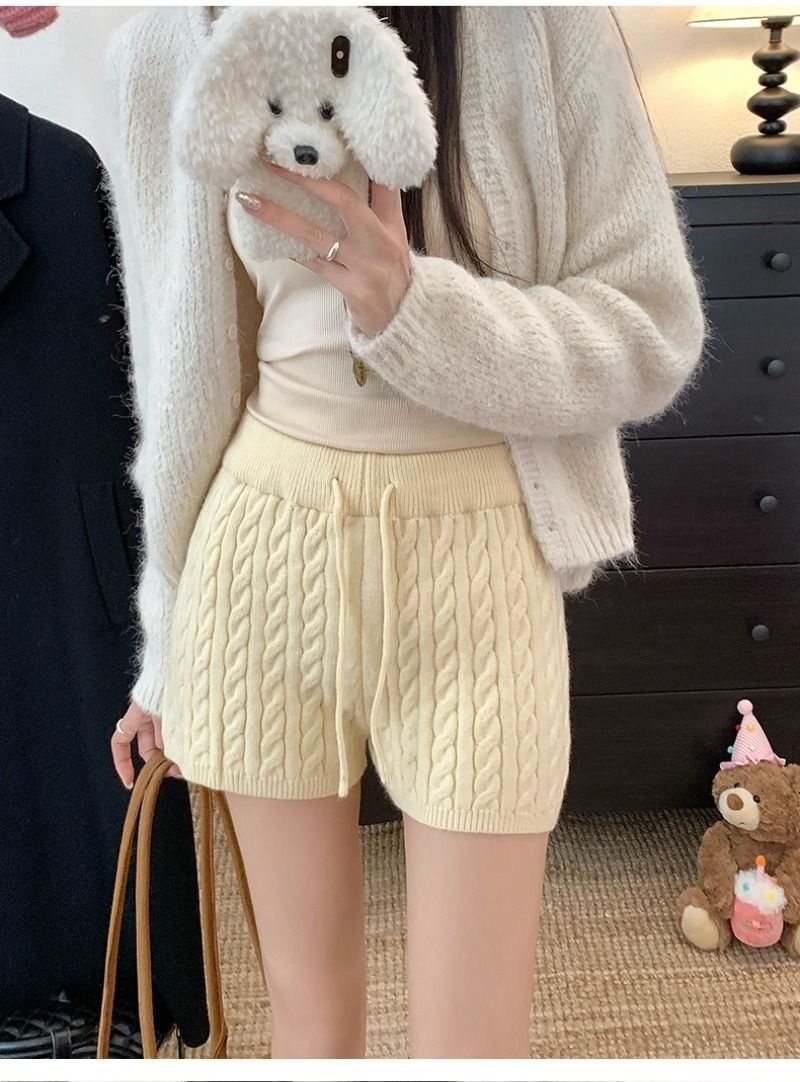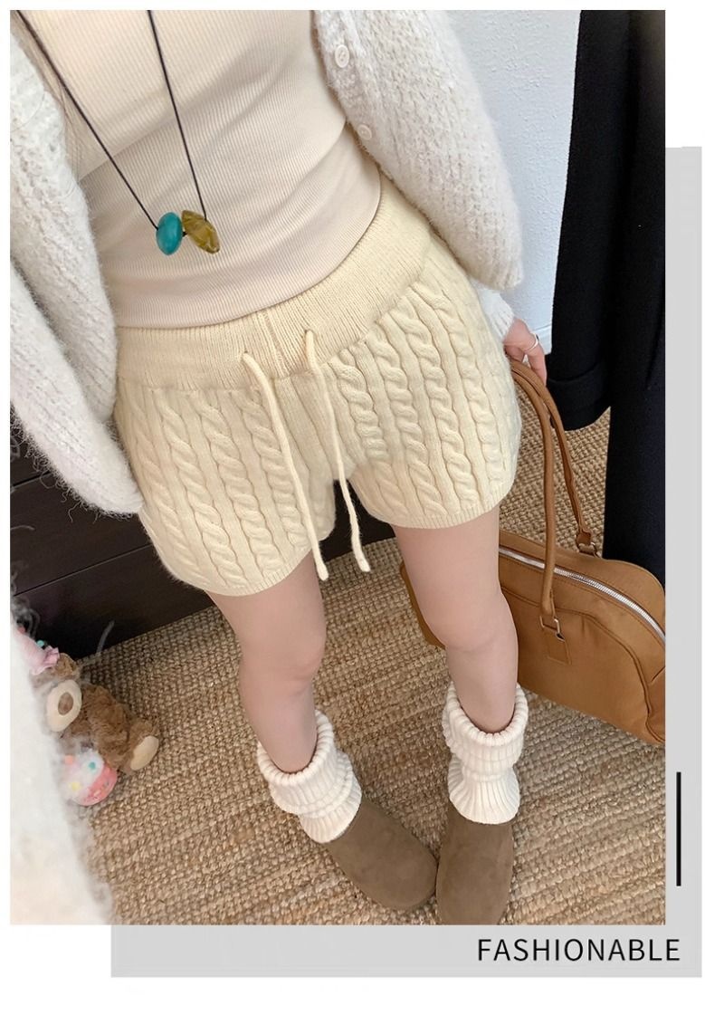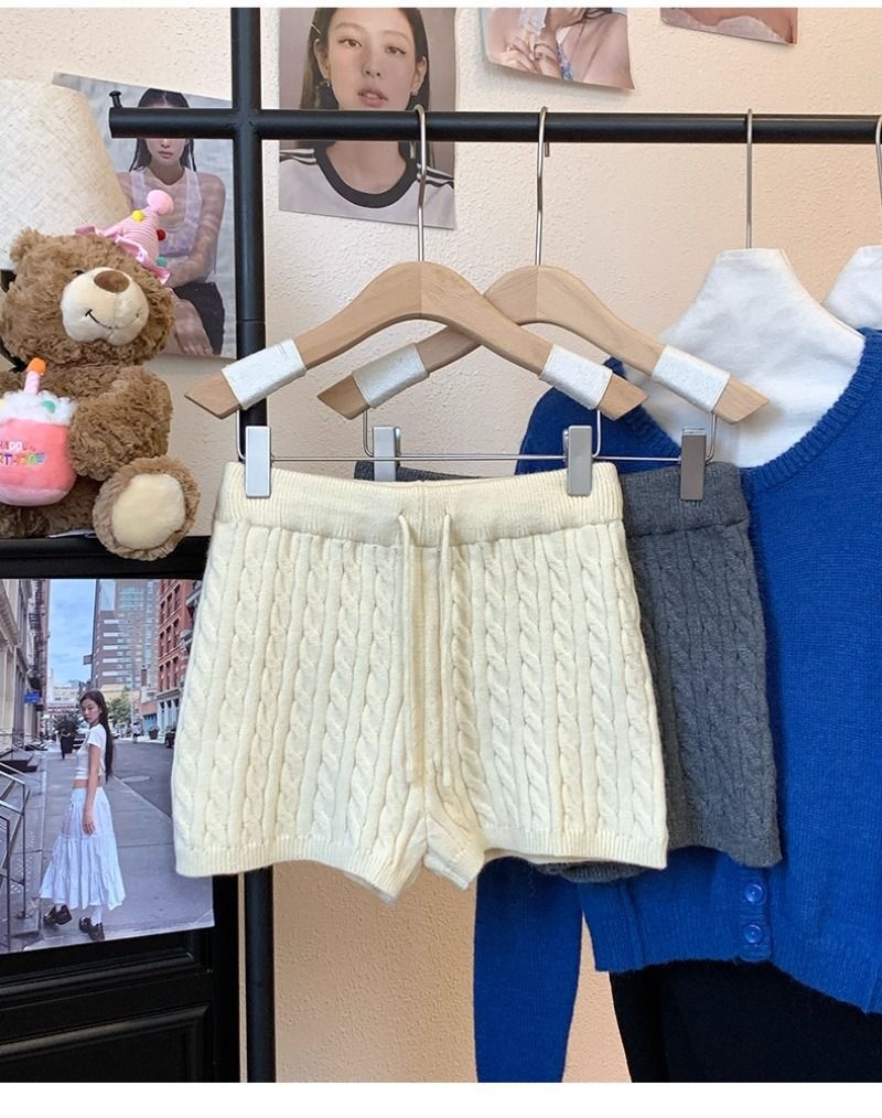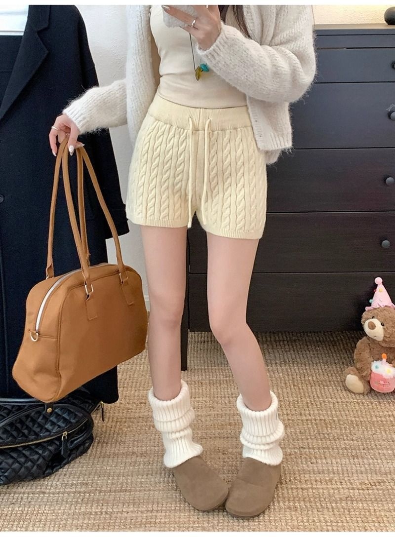 Retro Minimalist Cable-knit Linen Shorts With Elastic Waist
