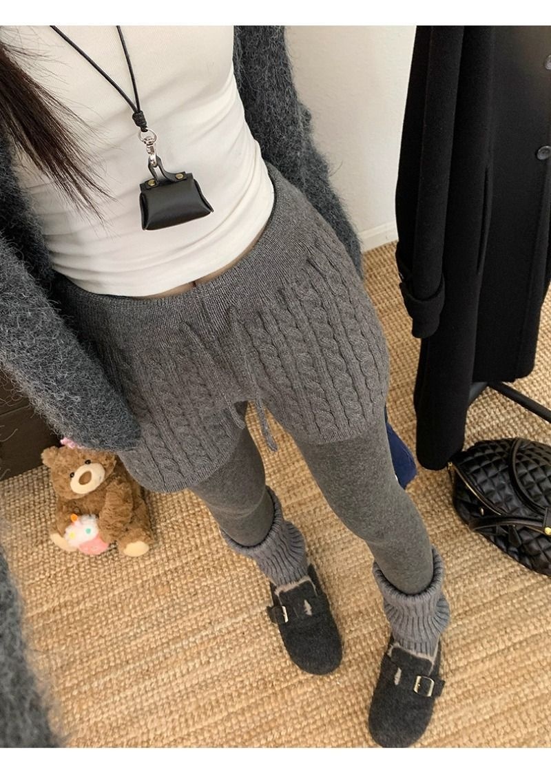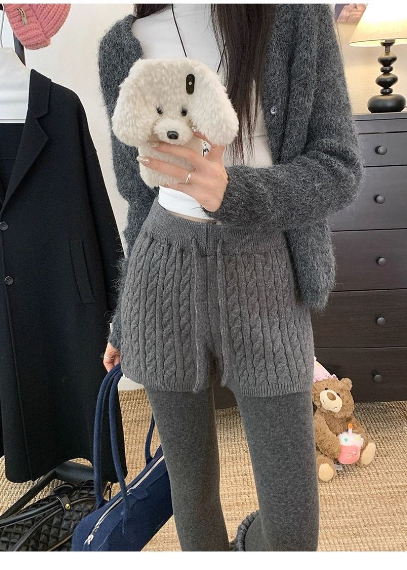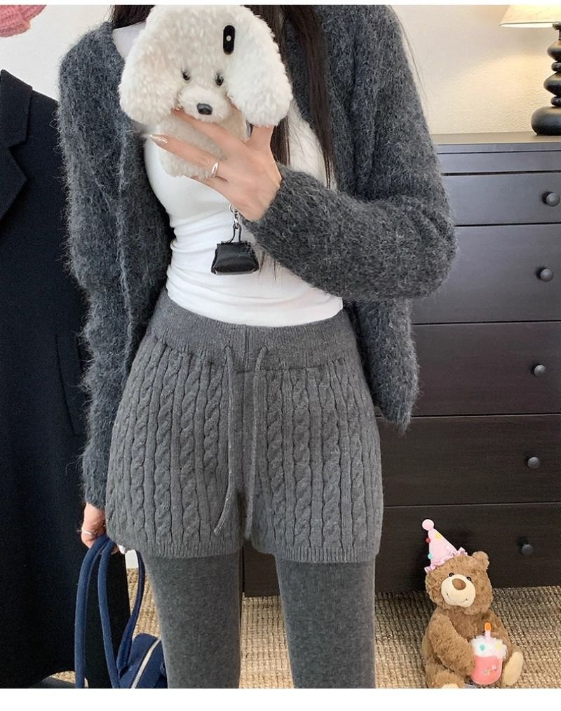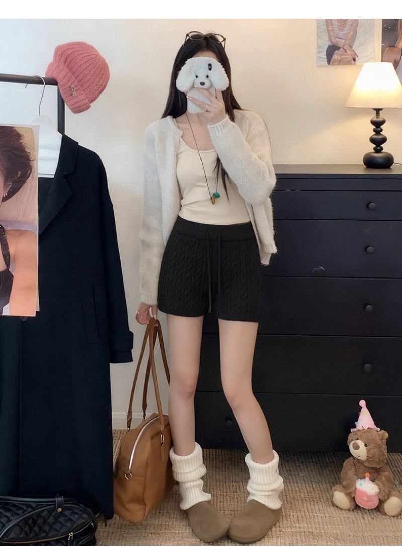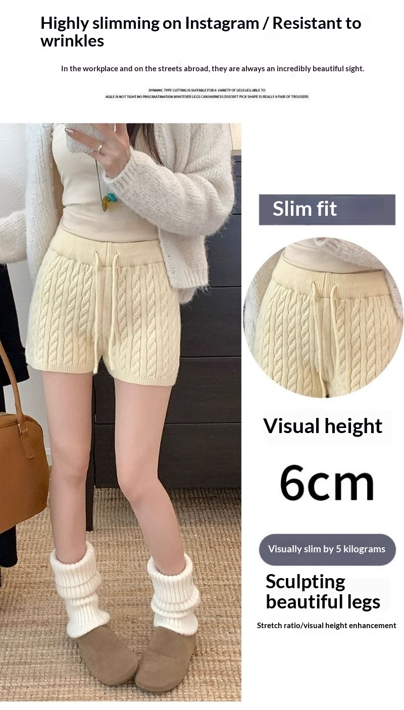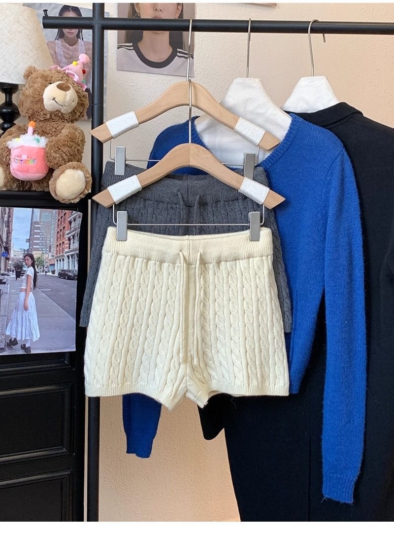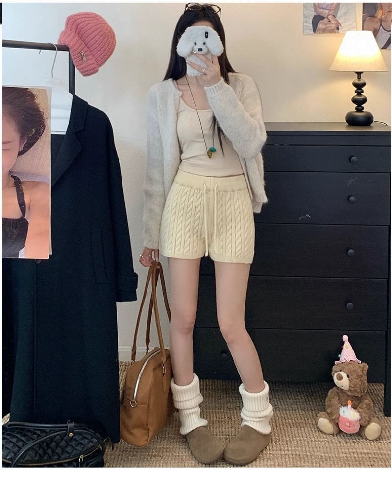 Retro Minimalist Cable-knit Linen Shorts With Elastic Waist